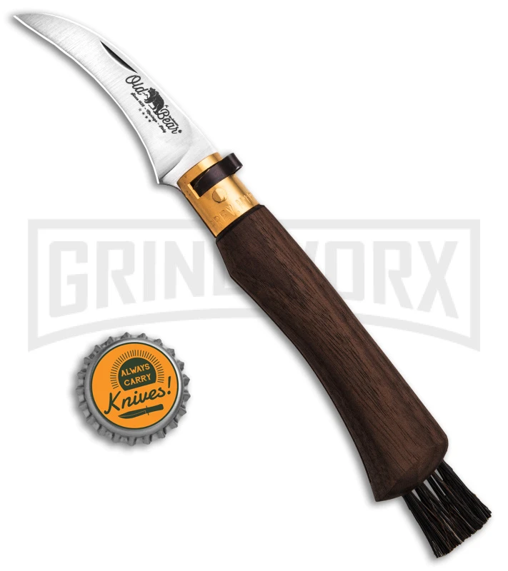 This Antonini Old Bear Mushroom knife has a satin stainless steel hawkbill blade and an American walnut wood handle.