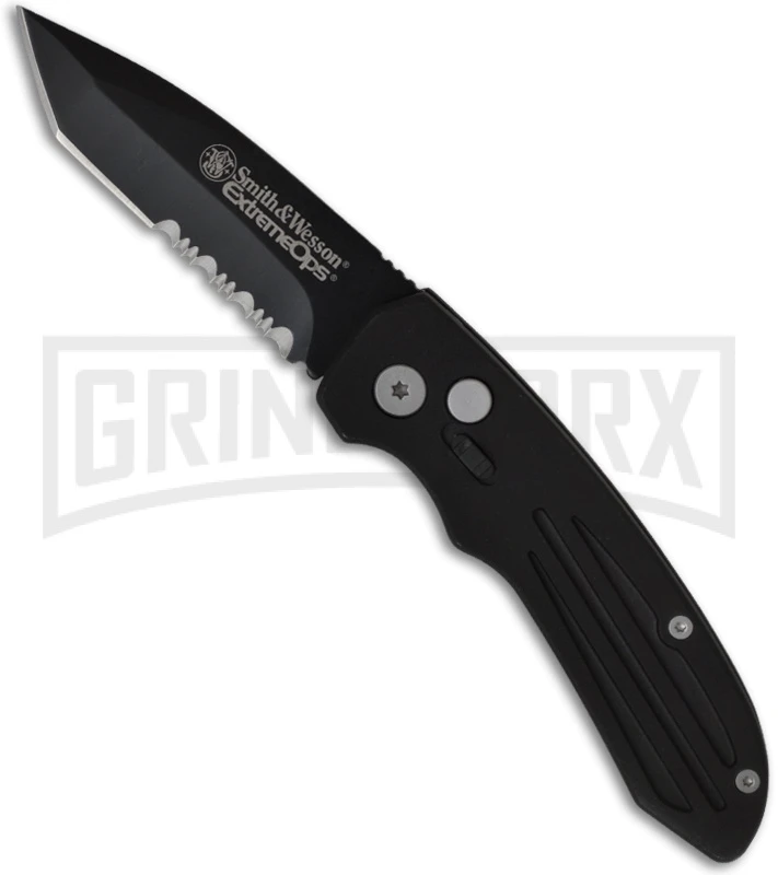The Smith & Wesson Extreme Ops SW50BTS is a great quality knife with fast action at a low price. The black finished 440 stainless steel tanto blade has a partially serrated edge. The push button quickly deploys the blade of this automatic conversion knife. The black coated aluminum handle features grooves to increase grip. The stainless steel pocket clip is tip-down for easy carry. This new version of the SW50 has a front mounted safety!